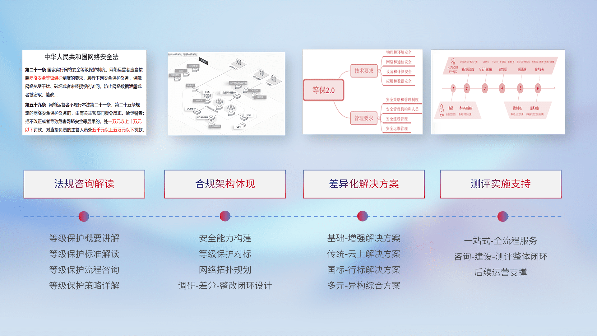 通过专业的法律咨询解读、、合规架构体现、、差异化解决方案、、、测试实施支持等服务,,,为客户量身打造等保合规体系。。。